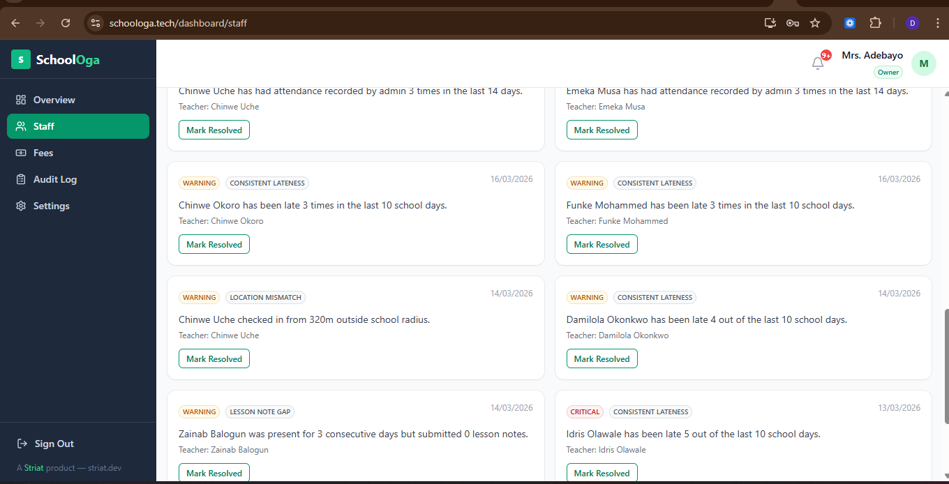 School management infrastructure for private schools. Pattern-based staff accountability, fee intelligence, and real-time financial visibility for owners.